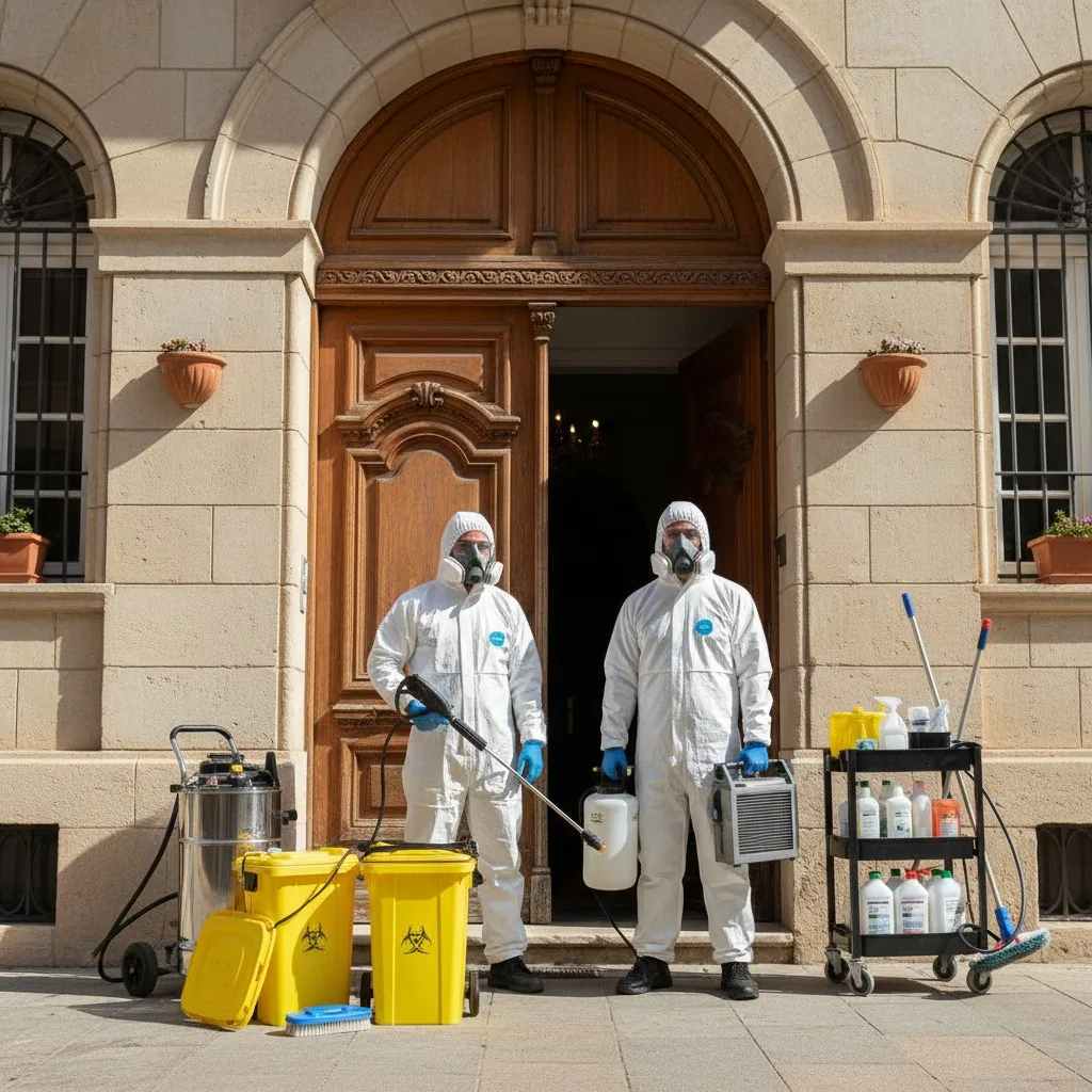 Desinsectación cuando es necesario. Si hay plagas, coordinamos el tratamiento antes de la limpieza profunda. Tratamiento de olores que los elimina de raíz, no los enmascara. Y gestión de residuos conforme a normativa — nada se deja en la calle.